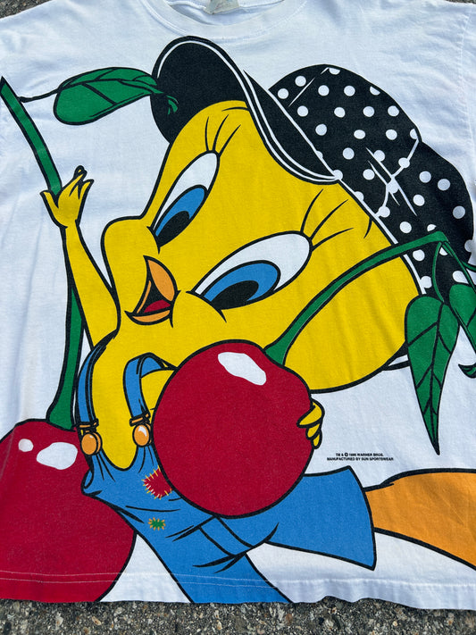 Vintage 1995 Single Stitch Full Print Tweety Bird Cherry Tee (L)